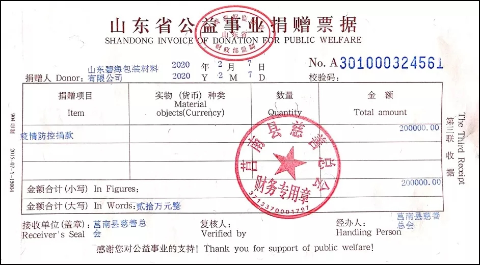 近來,新型冠狀病毒引起的肺炎疫情形勢嚴峻,時刻牽動著全國人民的心。共抗疫情,責(zé)任在肩,山東碧海包裝材料有限公司為了積極助力疫情防控,于2020年2月7日捐款人民幣20萬元,馳援抗擊疫情,所捐款項將用于抗擊新型冠狀病毒肺炎疫情。